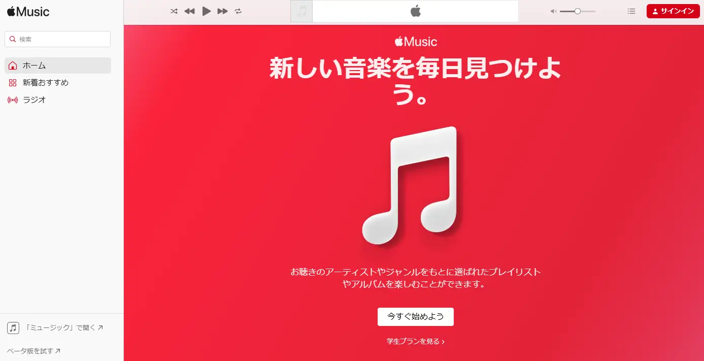 GoogleChromeなどのPCブラウザでApple MusicのWebプレイヤーにアクセス。トップ画面の右上にあるサインインをクリックしてください。