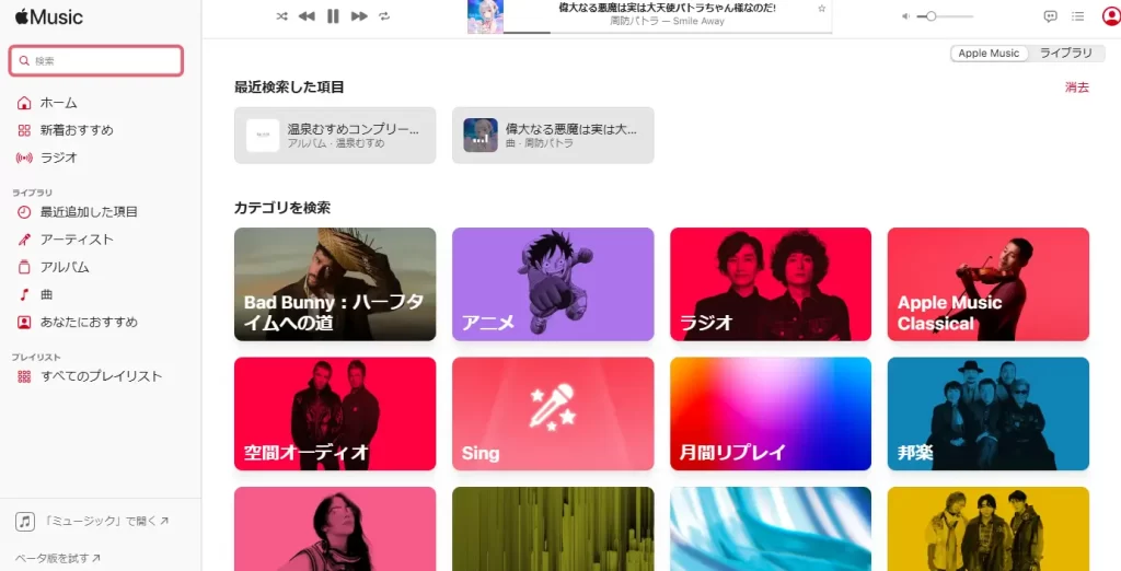 ログインが完了したらApple Musicのホーム画面に遷移。検索やピックアップなどから音楽を再生してみてください。