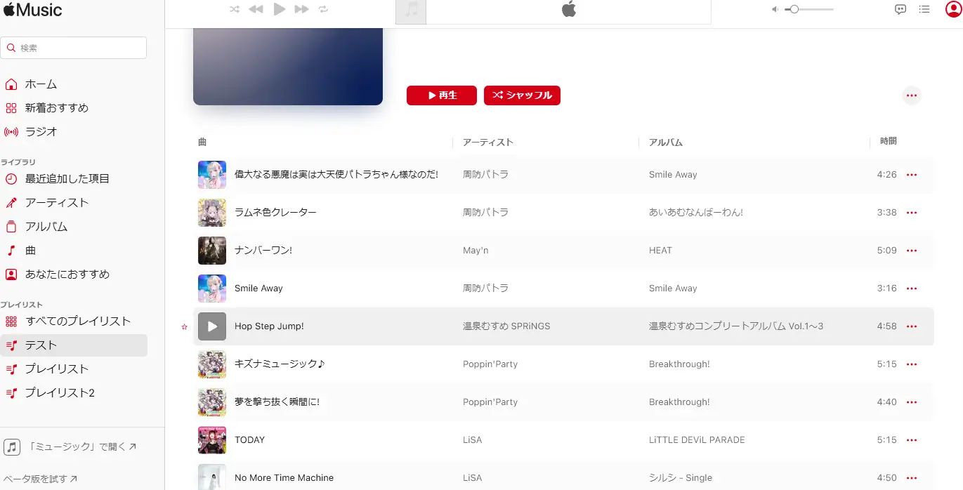 WebプレイヤーでもスマホのApple Musicアプリで作成したプレイリストを同期することができます。プレイリストから再生できるのは、Apple Musicで配信されている曲です。スマホ側の端末に保存している音楽ファイルを混合しているプレイリストの場合、その曲はスキップされます。