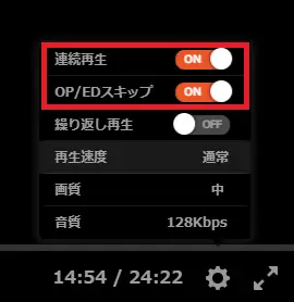 「連続再生」をオンにしておくと次のエピソードが自動で再生され、さらに「OP/EDスキップ」機能も引き続き適用。スムーズな作品視聴が可能です。