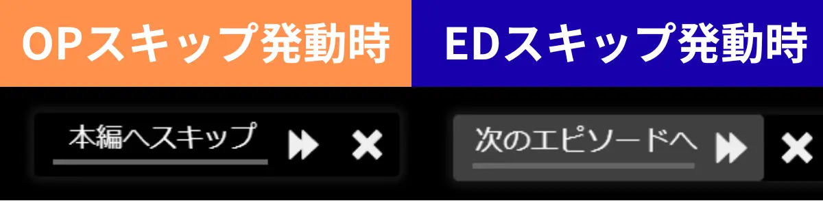 OP/EDスキップをオンにした際は、OP/EDで即時スキップされる場合と、一定時間経過からOP/EDされるという挙動で、作品によります。一定時間経過からOP/EDがスキップされる作品であれば、「本編へスキップ」や「次のエピソード」をクリックすると即座にOP/EDがスキップされます。
