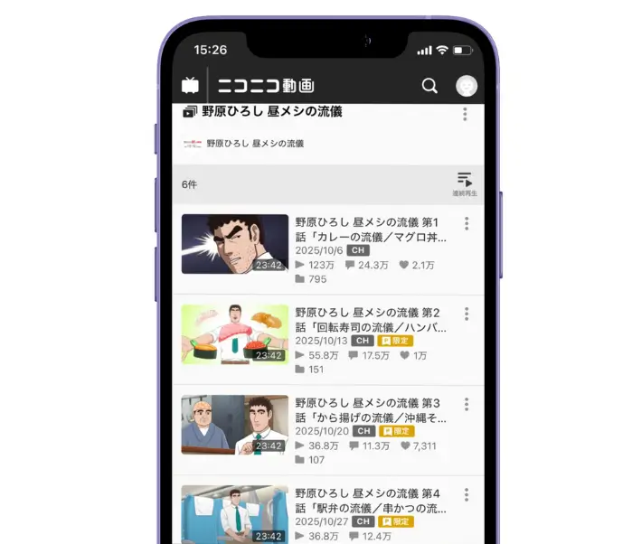 「野原ひろし 昼メシの流儀」は、ニコニコ動画の「野原ひろし 昼メシの流儀」公式チャンネルでも配信中です。最新話は期間限定で無料配信され、無料対象以外のエピソードはニコニコプレミアム会員になると視聴することが可能です。
