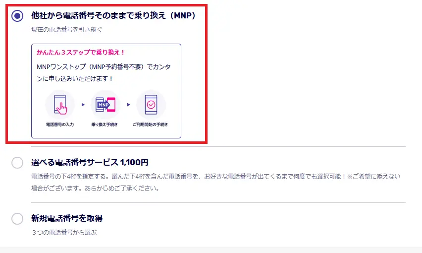 「他社から電話番号そのままで乗り換え(MNP)」を選択し、IIJmioで使っている電話番号を入力して手続きを進めてください。