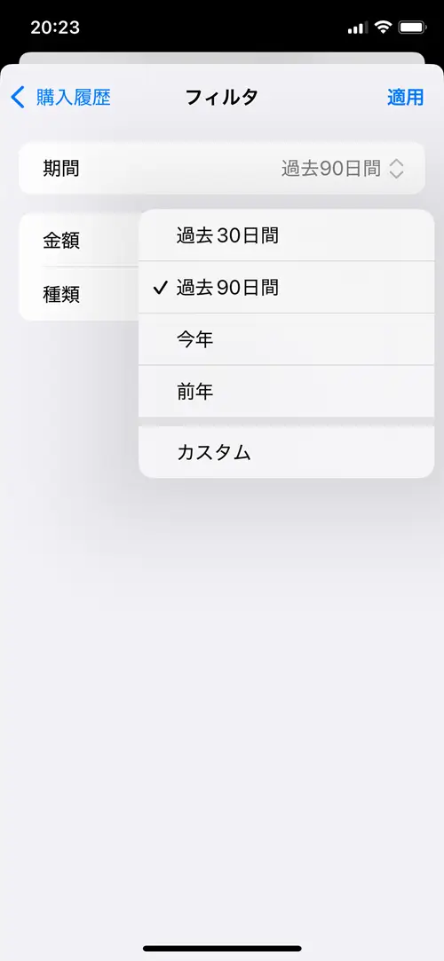 最初に表示される履歴は90日分。さらにさかのぼりたい時は、購入履歴最上部の「表示中」をタップし、各年月ごとの履歴を確認することが可能です。