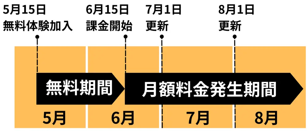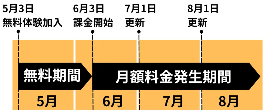 月初に加入すると課金開始月の月末までの期間のムダが少ない 月初に加入することで、課金開始タイミングである32日目が翌月の月初となります。上図の場合、5月3日から翌月6月2日までが無料期間です。6月3日より月額料金990円課金が開始されます。以降は、毎月1日に月末までの料金が発生するというサイクルになります。