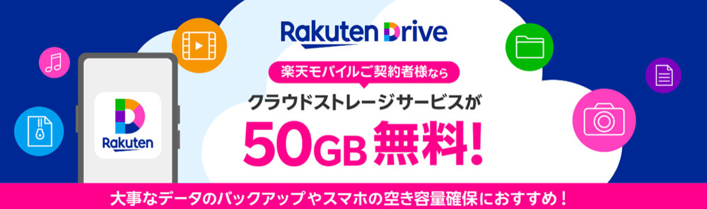 楽天ドライブ50GB無料は、楽天モバイル加入者向け特典のひとつ。楽天会員なら10GB無料で使えますが、楽天モバイル加入者なら自動で50GBへアップグレードされて使うことができます。