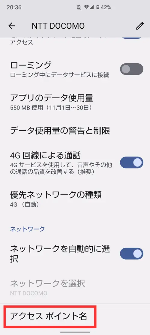 「アクセスポイントの編集」でAPN設定をおこないます。