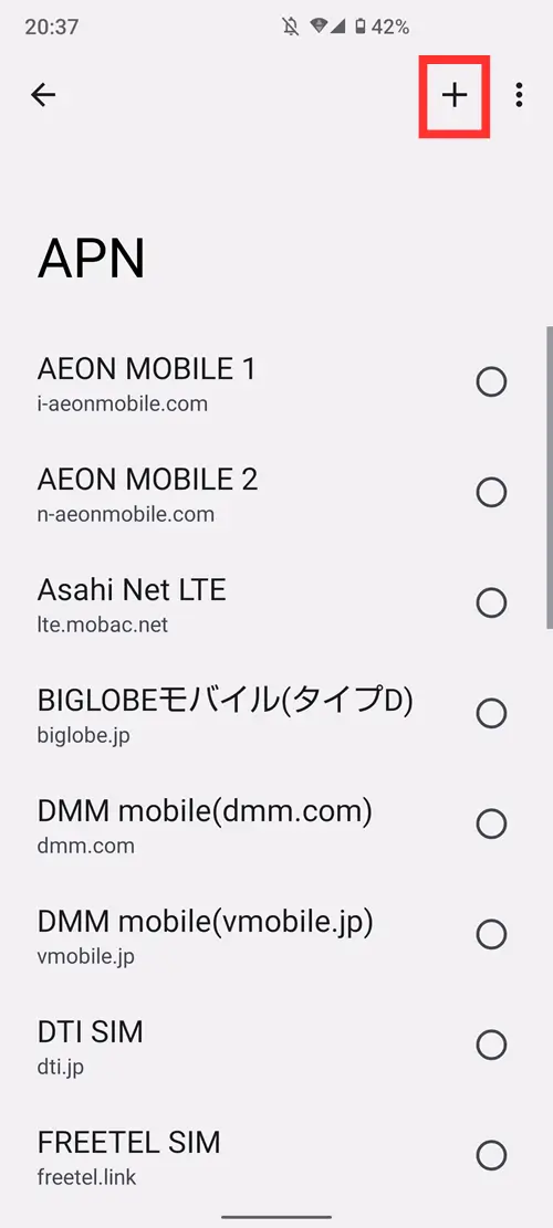 設定メニューを開き、「モバイルネットワーク」などの項目から「アクセスポイント名」を選択。APN画面が表示されたら「+」をタップします。上の画像の場合は、APN設定が一覧表示されており、その中に楽天モバイルもありますが、MVNOの楽天モバイルのAPN設定です。そのため、MVNOの楽天モバイルと現在の楽天モバイルではそもそもAPNの入力内容が異なるため、APN設定自体は手動でおこなわないといけません。