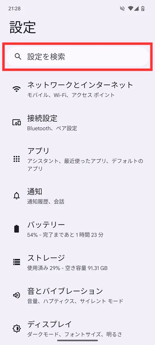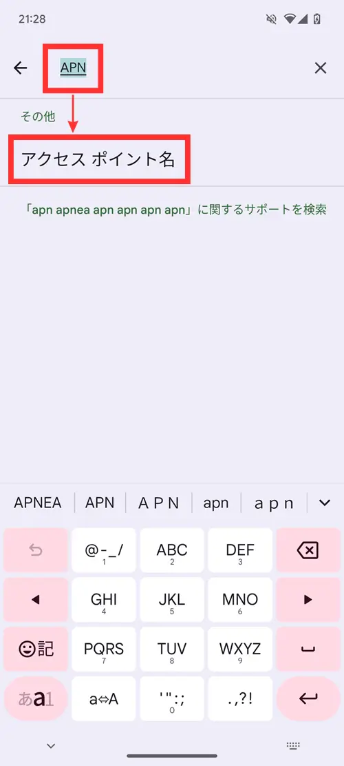 APN設定画面が見つからない時は、設定メニューにある検索窓から「APN」と入力して検索してみてください。画像はGoogle Pixelの設定メニューですが、ほとんどの機種は設定メニューに検索窓があるはずです。