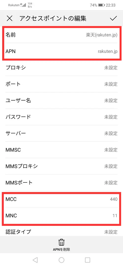 上の画像の場合、「APN自動設定」の項目が「?」となっており、楽天モバイルでのAPN自動設定について未確認の機種です。「?」になっていてもSIMカードを挿してみればAPNが自動設定される可能性もありますが、ほとんどが手動での設定が必要だと思っておいたほうがよいでしょう。