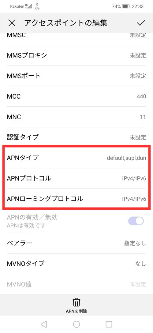 | APNタイプ | default,supl (テザリングを利用する場合は「dun」を追加) |