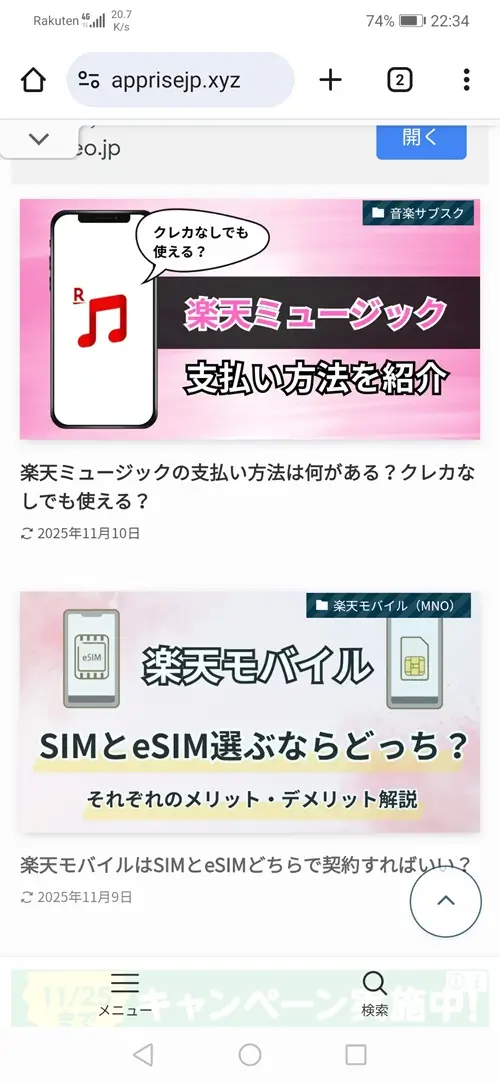 楽天回線に接続されたのを確認したら、ブラウザを起動してインターネットに接続できるか試してみましょう。Webサイトが表示されたら楽天回線でインターネットに接続できています。