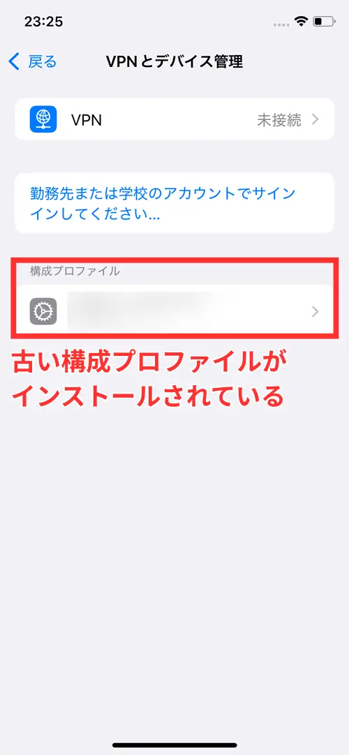 iPhoneの設定アプリを開き「一般」→「VPNとデバイス管理」の順番に進みます。「VPNとデバイス管理」の画面が表示されたら、「構成プロファイル」に古い構成プロファイルがインストールされているか確認してください。構成プロファイルがインストールされていたら、それをタップしましょう。