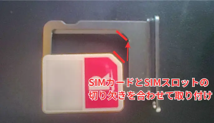 SIMカードとSIMスロット(SIMトレイ)切り欠きを合わせるように取り付けます。基本的にSIMカードの方向が正しくないとSIMスロットに取り付けられないようになっているので、正しい方向で取り付けをしてください。