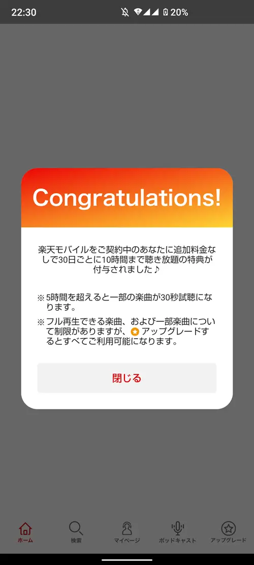 ライトプランは月額500円と格安で使えますが、月20時間までの制限が付き、さらに一部楽曲はフル再生することができません。Mrs. GREEN APPLEやPerfume、BTSなど、楽天ミュージック内でよく再生されているアーティストはライトプランの対象外となっているようです。