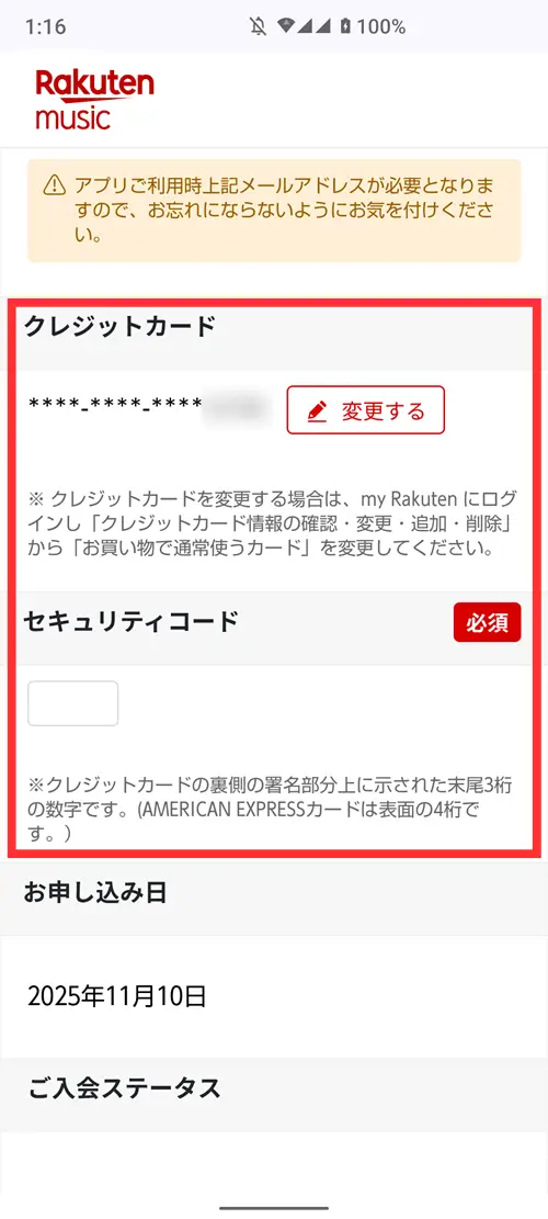 Web申し込みの場合、楽天IDに紐づいているクレジットカードが表示されます。別のクレジットカードを利用したい場合は、変更するをタップして楽天ミュージックの支払いに利用するクレジットカードを選択してください。