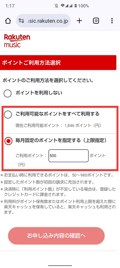 なお、アプリ内課金の場合、楽天ミュージックの料金を一部ポイントに充てるということができません。