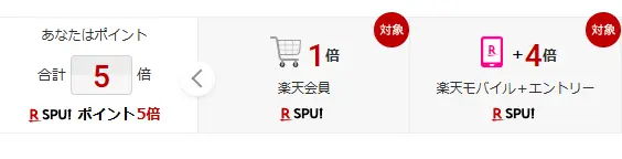 楽天モバイルを契約し、SPUアップのエントリーをすればSPUが+4倍となります。楽天会員の1倍と合わせれば、楽天グループの他サービスを利用しなくともSPUが5倍になります。エントリーが必須であるという点には注意が必要です。