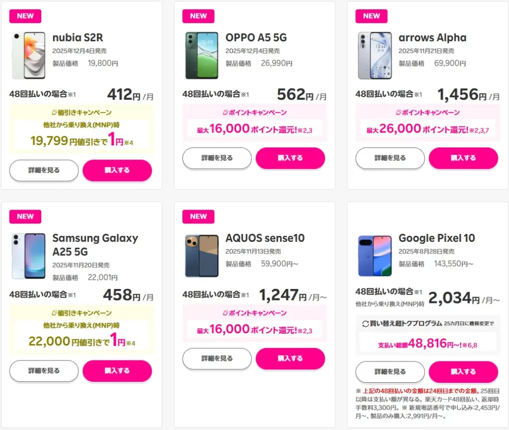 MNPで楽天モバイルに乗り換えるとキャンペーンで1円の機種もあるため、新しいスマホと一緒に楽天モバイルの回線を契約できます。
