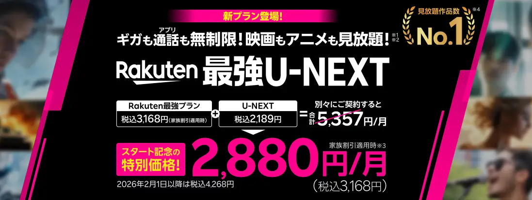 注意点としては月額料金が固定で、Rakuten最強プランのように使った分に応じて料金が変わらないということです。2026年1月末まではスタート記念価格の月額2,880円(家族割適用時)で利用ができます。2026年2月以降は月額4,268円(家族割適用時)となりなす。別々に契約すると月額5,357円なので、U-NEXTで動画を楽しみたい人、毎月のデータ量を気にせず使いたい人はRakuten最強U-NEXTプランがお得です。