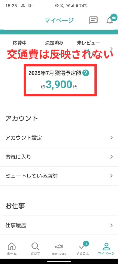 マイページの獲得予定金額に交通費は反映されず、受け取った給与分が表示されます。