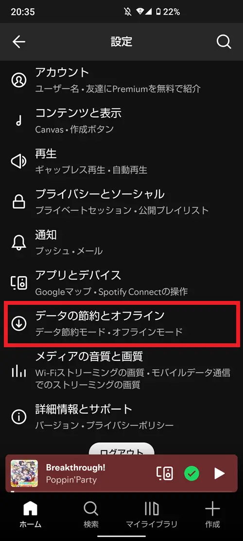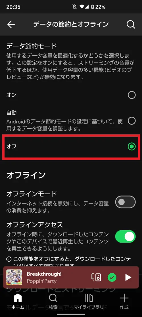 設定メニューからデータの節約とオフラインの項目を選択します。次の画面で「データ節約モード」を「オフ」に設定してください。「オン」もしくは「自動」になっていると、MVが再生されない可能性があります。