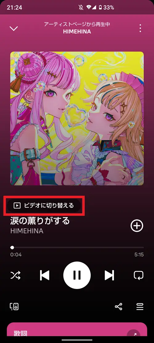 楽曲タイトルの上にビデオに切り替えるボタンが表示されていない場合、MV対象外の楽曲である可能性があります。また、アプリのバージョンが古いといった要因が考えられるため、以下で紹介する原因と対処法をチェックしてください。