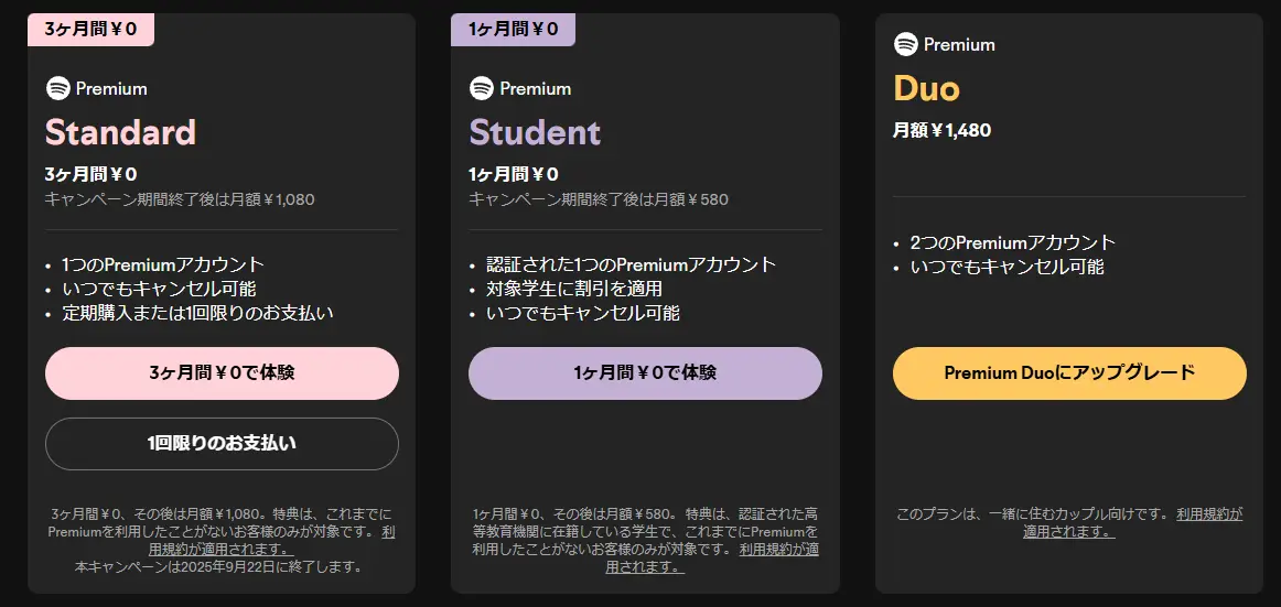 Spotifyの有料プランは4プランを用意。ひとりで使うのであれば、1080円/月の「Standardプラン」を選択しましょう。